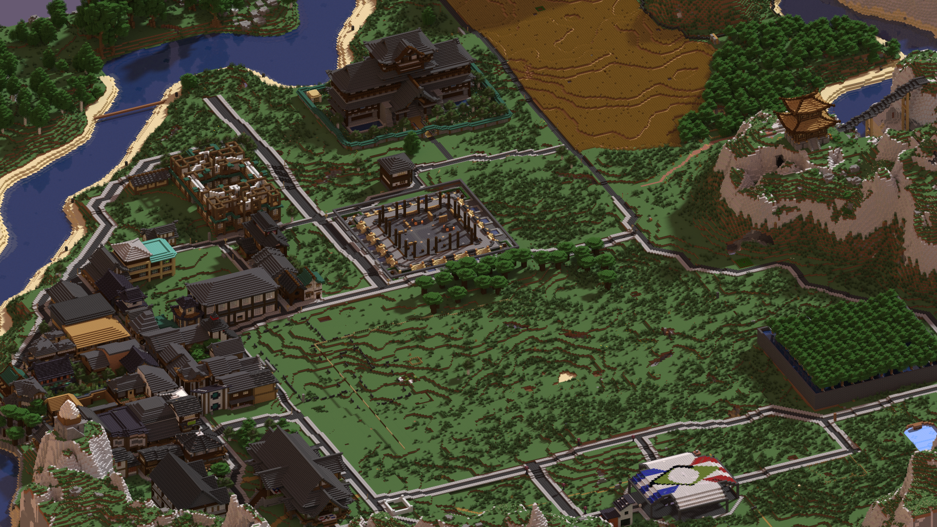 This week’s featured image is an overhead render of Nara’s main city, Shiroyama. It’s grown significantly in the past few weeks and aims to construct a city in a Late Imperial Japanese style. While its theme is similar to nearby Gensokyo, the city’s build structure is considerably different, focusing less on grand structures, and more on a suburban town, akin to Nara itself. Thanks to prawny331 for providing this image!
